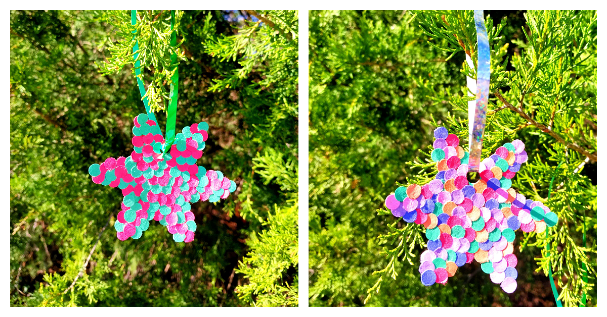 Đứa con út của tôi không có đủ kỹ năng để bấm giấy. Nhưng anh ấy đã có thể dán tờ giấy lên những đồ trang trí bằng bìa cứng. Những đứa con lớn của tôi không có vấn đề gì cả. Tất cả chúng tôi đều vui vẻ và nhâm nhi một ít ca cao sau đó chiêm ngưỡng những đồ trang trí mới trên cây.